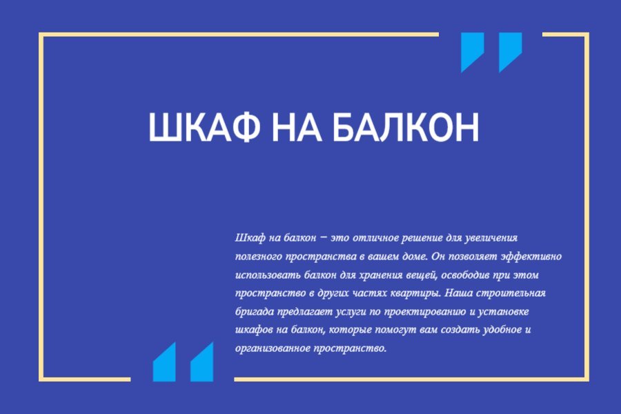 Наша строительная бригада имеет опыт в проектировании и установке шкафов на балконы и гарантирует высокий уровень сервиса и качества работы. Мы учитываем ваши пожелания и особенности вашего балкона, чтобы создать идеальное решение для хранения вещей.
